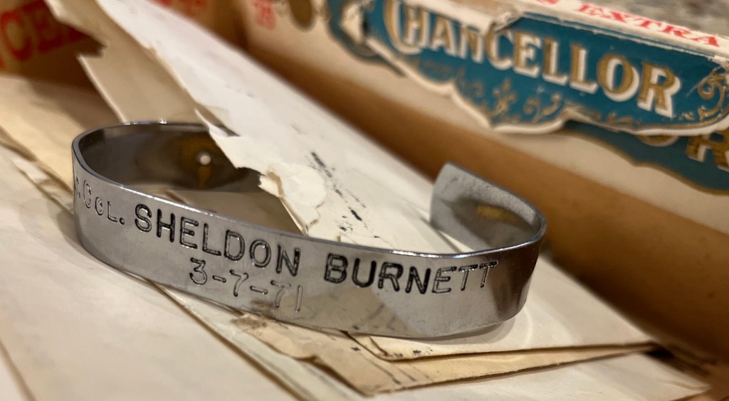 Included in her little box of memory inducing treasures were love letters from me during our brief engagement in 1975; a picture of her 1974 Korean mission team; some certificates of completion for various pursuits; and a nickel-plated bracelet on which was engraved the name of Colonel Sheldon John Burnett, and a date – March 7, 1971.